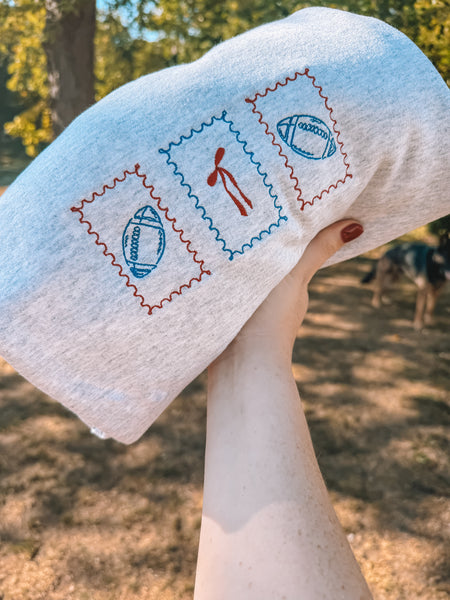 Get ready to score style points with our Football Stamp Sweatshirt! Designed for all team players, it features unisex sizing for the perfect fit. Make it truly yours by choosing two thread colors to customize your look. Cozy, fun, and ready for game day or lounging around!